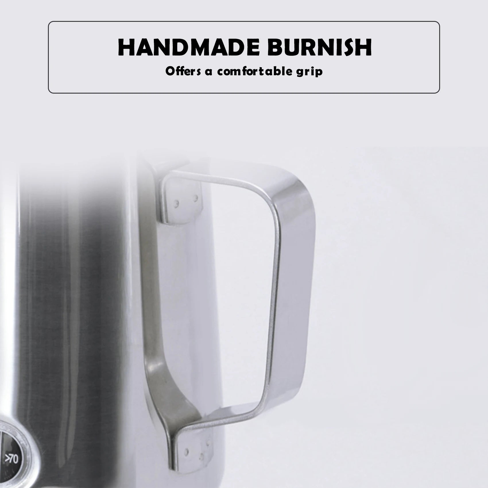 Made from premium 304 stainless steel, the jug resists rust, stains, and scratches. The beak-style spout makes latte art easier, while the integrated thermometer helps prevent overheating. A smart, stylish tool for baristas and coffee lovers alike.
